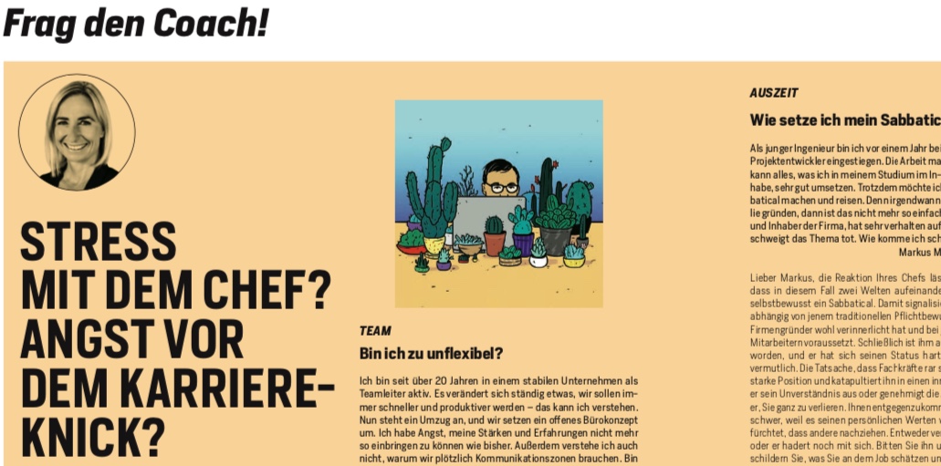 Bin ich zu unflexibel? Wie setze ich mein Sabbatical durch? Die Umstrukturierung klappt einfach nicht. Was kann ich tun? Meine Antworten auf diese drei Fragen habe ich für Focus Business 03/18 verfasst.