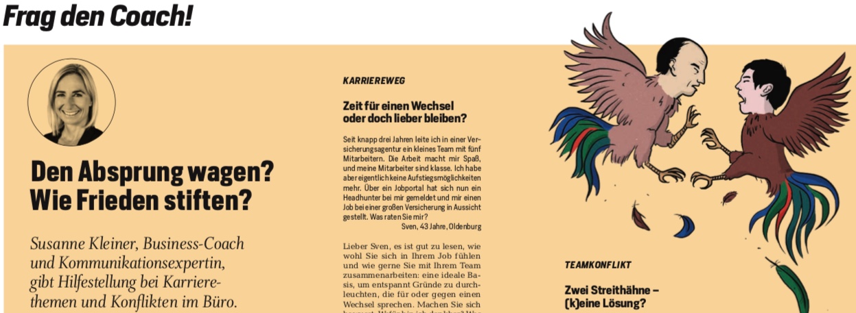 Zeit für einen Wechsel oder doch lieber bleiben? Zwei Streithähne - (k)eine Lösung? Noch mal von vorn beginnen? Ich habe für Focus Business geantwortet. "Frag den Coach" ist in der Ausgabe 2/19 erschienen.