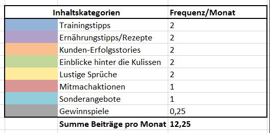 Das Fitnessstudio XYZ postet also insgesamt circa 12 Beiträge pro Monat, davon 2 Trainingstipps, 2 Einblicke hinter die Kulissen, etc. und alle 4 Monate bzw. 3 Mal im Jahr folgt ein Gewinnspiel.